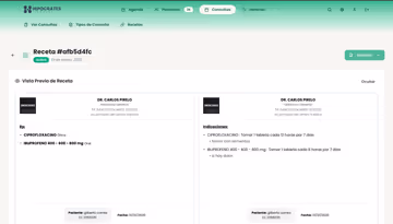Genera recetas digitales con firma electrónica. Integración con Vademécum para consultar medicamentos.